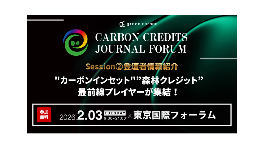ネイチャーベースのカーボンクレジット創出・販売事業を展開するGreen Carbon株式会社(代表取締役:大北潤、以下Green Carbon(グリーンカーボン))は、国内最大級のカーボンクレジット特化フォーラム「Carbon Credits Journal Forum(以下、本Forum)」を、2026年2月3日(火)に東京国際フォーラムB7ホール(有楽町駅直結)にて開催します。国内外の脱炭素主要プレイヤー500名以上が一堂に会し、カーボンクレジットの未来を本気で語り合う場を提供します。