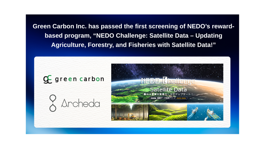 Green Carbon Inc. (CEO: Jun Okita, hereinafter “Green Carbon”), which develops a nature-based carbon credit generation and sales business, has partnered with Archeda, Inc. (Head Office: Chiyoda-ku, Tokyo; Representative Director: Hiromasa Tsumura; hereinafter “Archeda”), a company developing dMRV solutions for nature-based carbon credit projects using satellite data. Together, we applied for the NEDO-sponsored program “NEDO Challenge: Satellite Data – Updating Agriculture, Forestry, and Fisheries with Satellite Data!” (hereinafter, “the Program”) and have successfully passed the first screening.