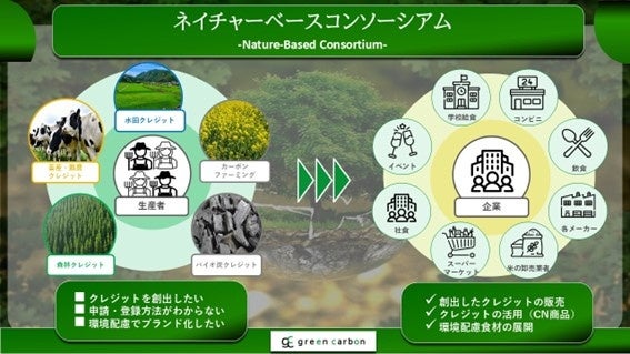 Green Carbonはこれまで、*¹稲作コンソーシアムを通じて水田農家の皆様をまとめ、J-クレジット制度への申請を行ってまいりました。自然由来のカーボンクレジットには、水田クレジットにとどまらず、森林、バイオ炭、畜産酪農、カーボンファーミングなど、多岐にわたり、多大な可能性を秘めています。しかし、個別に申請するには、水田クレジットと同様、数百万円規模の初期費用や煩雑な申請手続きが必要となるため、個人での取り組みには多くの障壁が存在します。そこで、こうした多様なプロジェクトに参画する生産者の皆様の申請の包括的にご支援をするプラットフォームとして、「ネイチャーベースコンソーシアム」を発足いたしました。