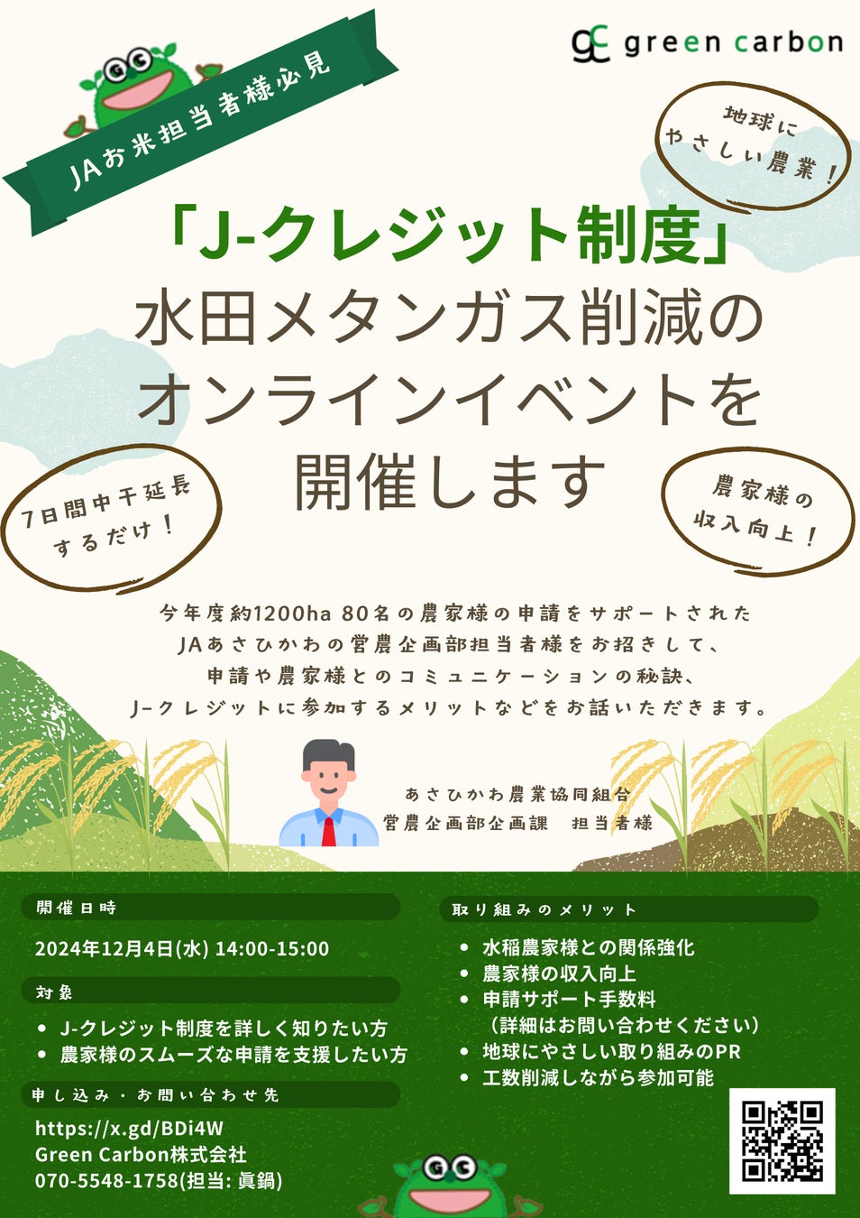 Green Carbon株式会社(代表取締役:大北潤、以下Green Carbon(読み;グリーンカーボン))はこの度、水田の中干し期間延長によるJ-クレジット創出に向けたJA(農業協同組合)様対象のオンライン勉強会イベント(以下、本イベント)を開催する運びとなりました。今回ゲスト登壇者としてJAあさひかわ様をお招きし、全国のJA様のご参加をお待ちしております。