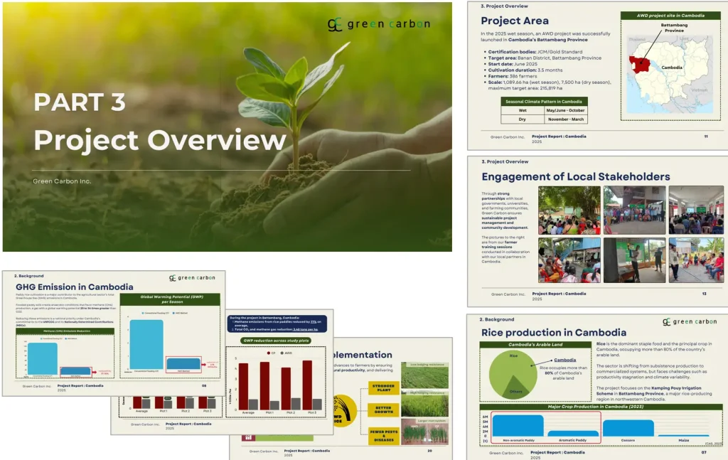 国内最大規模のネイチャーベースのカーボンクレジット創出・販売事業を展開するGreen Carbon株式会社(代表取締役:大北潤、以下Green Carbon(グリーンカーボン)は、カンボジア王立農業大学(RUA)、農林水産省(MAFF)、および地方自治体パートナーと連携し、カンボジア北西部バッタンバン州において、同国最大規模の間断灌漑(AWD※1)プロジェクト(以下、本プロジェクト)を推進しています。この度、本プロジェクトで得られた、メタンガス排出量削減、収量増加、水使用量削減などのプラスの影響を、報告書「Cambodia 2025 Wet Season AWD Project Report」として無料公開したことをお知らせします。