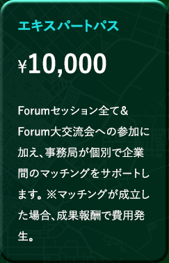 本Forumの登壇企業、 Forum大交流会への参加申し込みの方との大交流会を実施します。 帝国ホテル様が提供するケータリング/ビュッフェ形式のお食事と (※一部環境に配慮した食材を使用)、アルコール/ソフトドリンク飲み放題を提供させてい ただきます。脱炭素の主要プレイヤーとの交流の機会となりますので、是非ともご参加ください。