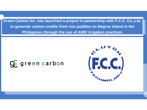 Green Carbon ,Inc. has launched a project in partnership with F.C.C. Co.,Ltd. to generate carbon credits from rice paddies on Negros Island in the Philippines through the use of AWD irrigation practices