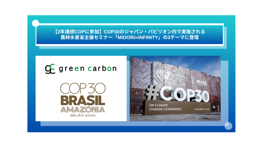ネイチャーベースのカーボンクレジット創出・販売事業を展開するGreen Carbon株式会社(代表取締役:大北潤、以下Green Carbon(グリーンカーボン))は、2025年11月10日(月)から11月21日(金)までブラジル・ベレンで開催される「国連気候変動枠組条約第30回締約国会議(以下、COP30)」のジャパン・パビリオンに、昨年のCOP29に引き続き2年連続で参画します。本年度Green Carbonは、ジャパン・パビリオン内で農林水産省が主催するセミナー「MIDORI∞INFINITY」3テーマに登壇し、気候変動対策、GHG排出量削減施策・技術の海外展開、金融機関との連携等を紹介します。今回は第一弾として、COP30への登壇のお知らせとなりますが、引き続きCOP30の概況レポートを発信してまいります。