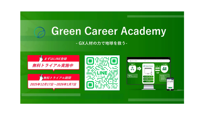 Green Career Academy公式LINEに友達登録いただいた方を対象に、2026年1月7日(水)まで無料で利用可能となるキャンペーンを実施中です。世界的に加速する脱炭素潮流に備えるため、誰もが“すぐに学べる・深く理解できる”新しいGX学習体験をお届けし、脱炭素スキルを「キャリアの武器に」にします。下記URL、QRコードよりLINE友達登録をお願いします。